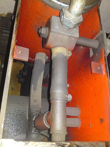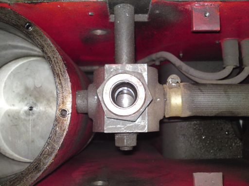 Anschluß an den Antriebszylinder. Oben: der Anschluß für das Kniestück zum Luftfilter Top view inside the valve. Right the hose to the ram. on the top side the shaft to the foot pedal. Here on top the knee pipe to the air filter is installed. |