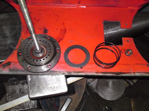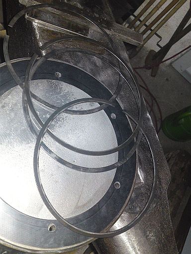 Zylinders mit der neu angefertigten Gummidichtung The four piston rings of the ram. Underneath the cylinders cover with newly made rubber gasket |