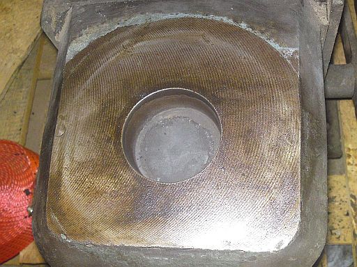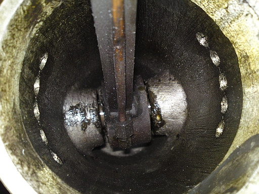 von oben in den Zylinder, in dem der Bär läuft. Gut zu sehen sind die beiden Löcher in der Zylinderwand, die für Auf- und Abbewegung des Bären sorgen. Die schwarze Verkrustung auf der Dichtfläche kommt höchstwahrscheinlich von einer Dichtpaste. Sie wurde entfernt und durch eine handgefertigte, ölfeste Gummidichtung ersetzt. Top front view inside the ram´s cylinder. Clearly visible: the two bores for the up and down movement of the ram. The black residue comes from the old sealant, |