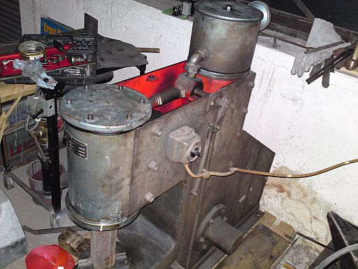 Bären. Die Gesenkaufnahme unten ist schon - wie auch (nicht sichtbarerweise) der Bär - um 60° gedreht. Auf der Plakette steht leider nirgendwo das Baujahr. Der angebaute Stern - Dreieck - Schalter scheint original zu sein, jedoch schaltet er nicht zwischen Stern und Dreieck um ... ?!? ![]() Ram and cover mounted, ram and lower die turned to an angle. On the type plate is no year of manufacture. This hammer runs on 3ph 400V 16A, this is common in germany. The delta-wye-switch on the side seems to be original, but does not switch. |