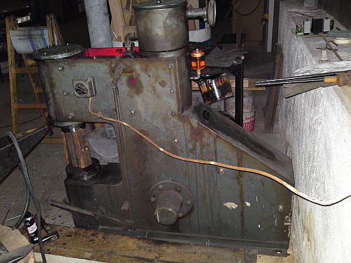 natürlich ebenfalls noch VDE - konform erneuert. Der Holzblock vorne soll den Bären möglicht weit eingefahren halten, damit die Oberfläche des Bären möglicht unversehrt und ohne Rost bleibt. Side-view. Still standing on the palette, the hammer is mostly covered with dirt. The connection cable will also be replaced to match VDE requirements. The piece of wood just keeps the ram inside the cylinder for rust protection. |