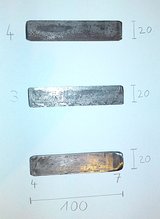 Nachfrage: Hier seht ihr die Keile, die das Gesenk am Bär klemmen. Die ersten beiden sind nur einfaches, gerades Bandeisen, der untere Keil ist konisch, von 7 mm auf 4 mm. Wichtig ist, daß keiner der Keile länger als 100 mm ist, besser wären 98 mm. Grund: Sollte der Bär ganz in die Führung laufen beschädigt er diese sonst (siehe unsere Führung, leider) Das es insgesamt drei Keile sind liegt daran, daß man somit die Gesenke gut aufeinander ausrichten kann; das untere Gesenk wird mit nur einem Keil geklemmt. On request: These are the wedge an the shim of the ram´s die. What is important ist, that the length of the wedge or the shim should not be longer than 100mm, better 98mm, because otherwise it will stand out of the ram and damages the guide of the rams severely. Later editions of the Kuhn/Reiter hammer have a different guide system, the ram will not hit the guide |