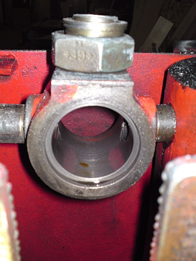 Druck auf die Kugel zu erhöhen. The pressure relief / adjustment valve. The spring pushed the ball gently upwards to close the valve. In the lower cylinder are three bores for the splint pin holding the spring in place. With these bores the upper idle position of the ram can be adjustet. |