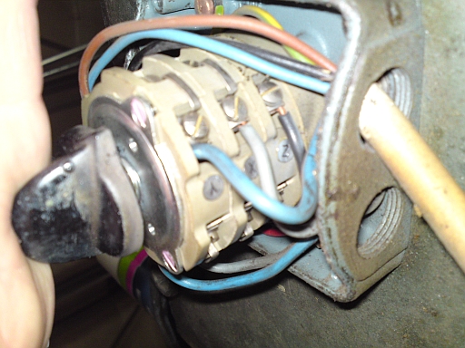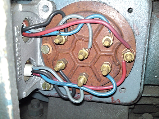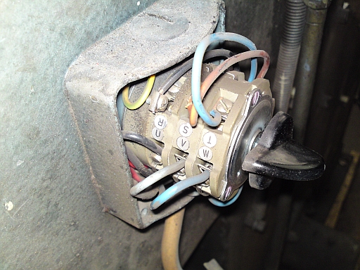 Stern - Dreieck - Schalter, von oben gesehen. Ob der ein Originalteil ist kann ich nicht sagen. R-S-T sind die drei Phasen aus dem Netz (heute normal mit L1 bis L3 bezeichnet) U-V-W ist die eine Leitung zum Motor..... |