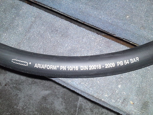 den Zylindern. Dies ist ein Preßluftschlauch nach DIN, bekannt vom Preßlufthammer an Baustellen, hoher Berstdruck, mittig armiert. Innendurchmesser ca. 25 mm (1"), damit paßt er auf die Rohrstücke von Überdruckventil usw. Geht etwas streng drauf, daher unbedingt dran denken: VORHER die Schlauchschellen drüberschieben !! Warum den Schlauch ? Weil man den ebenfalls nicht so oft erneuern muß. Bestimmt gibt es andere Schläuche, die auch geeignet sind, wir haben uns aber für die rustikale Variante des Überdimensionierens entschieden. Ein späteres Gespräch mit Herrn Kuhn hat allerdings gezeigt, daß ein normaler Wasserschlauch ausreichend gewesen wäre, da hier weniger Druck übertragen wird als wir vermutet haben. The two hoses connecting the two cylinders, we used special high-pressure hoses. In a later call with Mr. Kuhn we were told, that normal hoses from the gardening supply would have been sufficient. |
