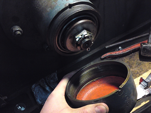 Büchse war noch 1/4 voll mit altem, harzigem Fett. Die Kronenmutter hält übrigens die Achse der Schwungscheibe durch zwei Lager fest. Trotz alles Restaurierungswillens: diese Kronenmutter sollte man nur dann lösen, wenn man muß, SW 35 oder Ähnliches ist nötig Zusätzlich haben wir.... Not easy to find, especially on a quite dirty machine. This is the cover of the main bearing of the flywheel, which is used for grease storage as well. At first, there is an Allen screw to be removed which sits exactly in the middle between cover and body. The cover unscrews very well afterwards. Being about 1/4 full of really old sticky grease, it hast been cleaned.The big castle nut securing the flywheel and the bearings was kept as it is. A metric socket about 35mm ist needed. |