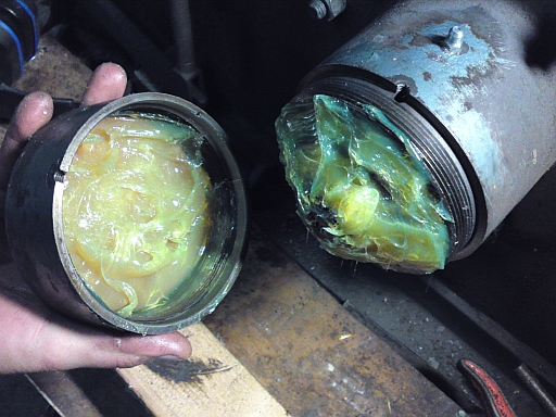 war (klar) defekt. Die einzige Möglichkeit war, vorsichtig einen Torx - Bit in die kleine Öffnung zu klopfen, Linksausdreher etc. klappte nicht. Es ist übrigens ein M6 - Gewinde. Danach haben wir zuerst unter ständigen Weiterdrehen Fett durch den neuen Schmiernippel gepreßt, um das hintere Lager vom alten Fett "freizuspülen". Dann richtig Fett auffüllen, durch das Zuschrauben wird auch etwas Fett eingepreßt. Wenn alles wieder verschraubt wurde einfach nochmal (bei uns: 10 Hübe) Fett durch den Schmiernippel pressen, das sollte beide Lager gut versorgen, dennoch nach wenigen Betriebsstunden nachschmieren, damit das alte Zeug mal ´rausgeht. The old grease nipple, dismantled by forcing a small torx bit inside. All other options failed. After replacing, we uses the grease gun to get rid of the most of the old sticky grease by slowly turning the flywheel while pumping. Filled with new grease and giving some 10 pumps of grease, it will be sufficient. |